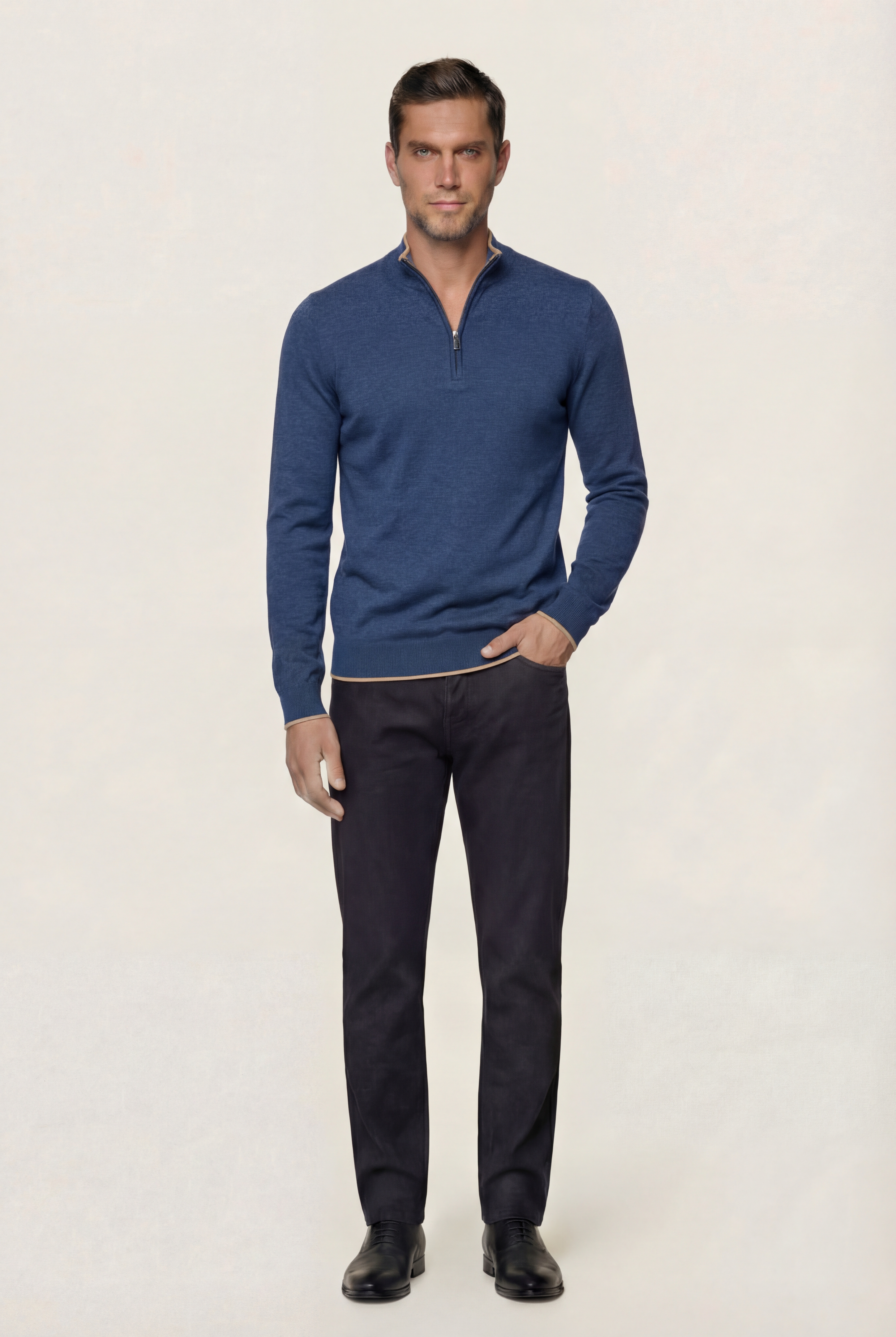 • Мужской джемпер на молнии с воротником — идеальный выбор для прохладных дней. Выполнен из качественных материалов, обеспечивающих комфорт и тепло на протяжении всего дня. Джемпер подходит для повседневной носки, работы в офисе или вечерних прогулок. Воротник-стойка защищает шею от ветра и холода, придавая образу дополнительную элегантность. Молния на воротнике позволяет регулировать уровень комфорта — вы можете застегнуть его до конца для максимального утепления или оставить немного расстегнутым для более расслабленного вида. Насыщенный синий цвет делает этот джемпер универсальным решением для любого случая. Джемпер легко сочетается с различными элементами гардероба — от классических брюк до джинсов, от рубашек до футболок. Джемпер станет незаменимой частью гардероба каждого мужчины, благодаря своей универсальности и качественному исполнению.
